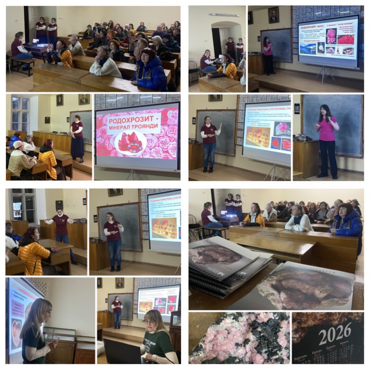 2 грудня 2025 р. – знаменна подія, адже відбулась премʼєра нової, ще й важливої для нашого музею події «Родохрозит – мінерал троянди»! І презентація гарненьких, свіженьких, присвячених родохрозиту календарів на 2026 рік з фотографіями найкращих зразків з експозиції музею.